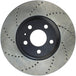 StopTech Drilled Sport Rotors are 1-piece direct replacement brake discs for factory brake systems and stock calipers that look great behind your wheels – and offer significantly improved braking performance. The unique cross-drilling aids with heat and brake dust dispersal, prevents glazing of the pads, adds bite and improves wet and dry braking performance. Built to last, the black e-coating provides protection from corrosion and the high carbon metallurgy (in most applications) offers quieter operation, better crack resistance and increased performance.