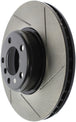 StopTech Slotted Sport Rotors are 1-piece direct replacement brake discs for factory brake systems and stock calipers that look great behind your wheels – and offer significantly improved braking performance. The unique slotting aids with heat and brake dust dispersal, prevents glazing of the pads, adds bite and improves wet and dry braking performance. Built to last, the black e-coating provides protection from corrosion and the high carbon metallurgy (in most applications) offers quieter operation, better crack resistance and increased performance.