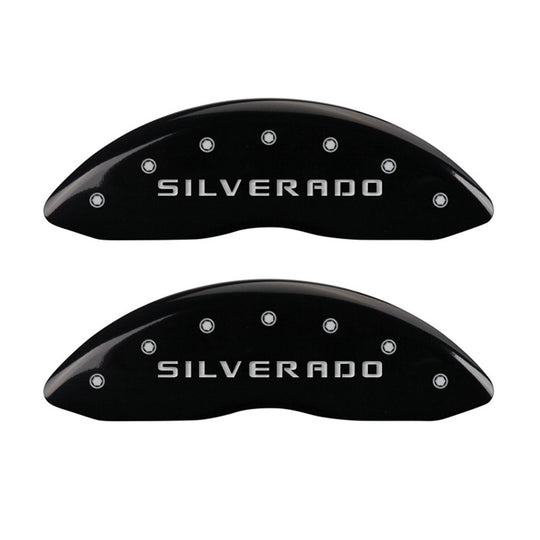 MGP Front set 2 Caliper Covers Engraved Front Silverado Black finish silver ch