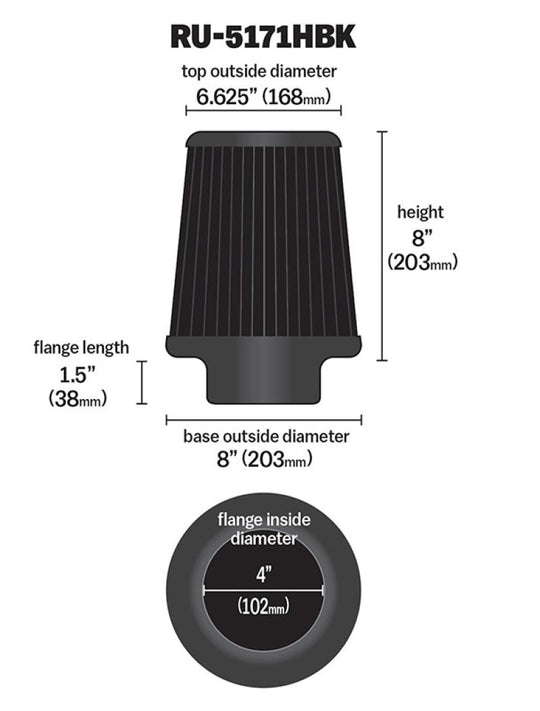 K&N Universal Rubber Filter-Round Tapered 4in Flange ID x 8in Base OD x 6.625in Top OD x 8in H
