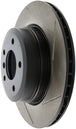 StopTech Slotted Sport Rotors are 1-piece direct replacement brake discs for factory brake systems and stock calipers that look great behind your wheels – and offer significantly improved braking performance. The unique slotting aids with heat and brake dust dispersal, prevents glazing of the pads, adds bite and improves wet and dry braking performance. Built to last, the black e-coating provides protection from corrosion and the high carbon metallurgy (in most applications) offers quieter operation, better crack resistance and increased performance.
