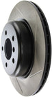StopTech Slotted Sport Rotors are 1-piece direct replacement brake discs for factory brake systems and stock calipers that look great behind your wheels – and offer significantly improved braking performance. The unique slotting aids with heat and brake dust dispersal, prevents glazing of the pads, adds bite and improves wet and dry braking performance. Built to last, the black e-coating provides protection from corrosion and the high carbon metallurgy (in most applications) offers quieter operation, better crack resistance and increased performance.
