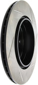 StopTech Slotted Sport Rotors are 1-piece direct replacement brake discs for factory brake systems and stock calipers that look great behind your wheels – and offer significantly improved braking performance. The unique slotting aids with heat and brake dust dispersal, prevents glazing of the pads, adds bite and improves wet and dry braking performance. Built to last, the black e-coating provides protection from corrosion and the high carbon metallurgy (in most applications) offers quieter operation, better crack resistance and increased performance.